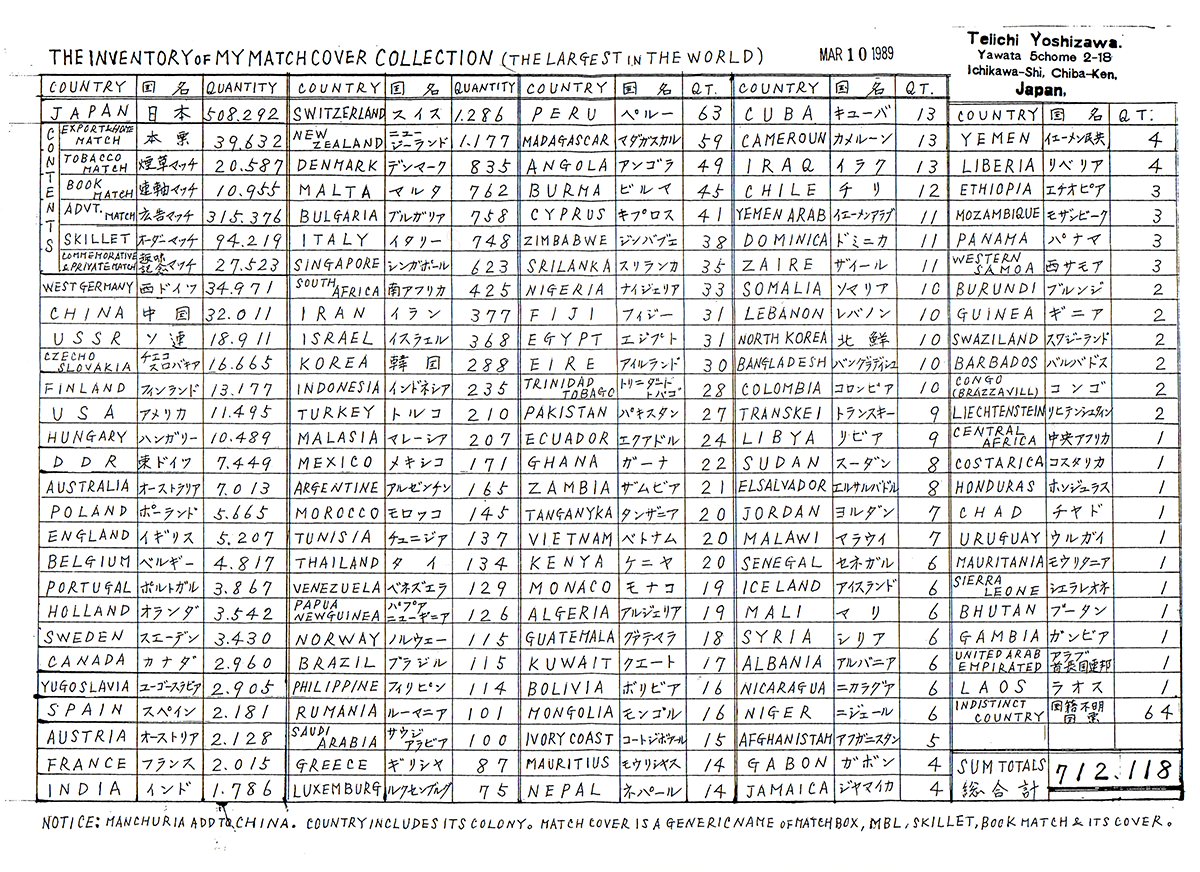 私がいただいた手許にある1989年の収集記録資料では119か国のマッチラベル712118枚と記されている。